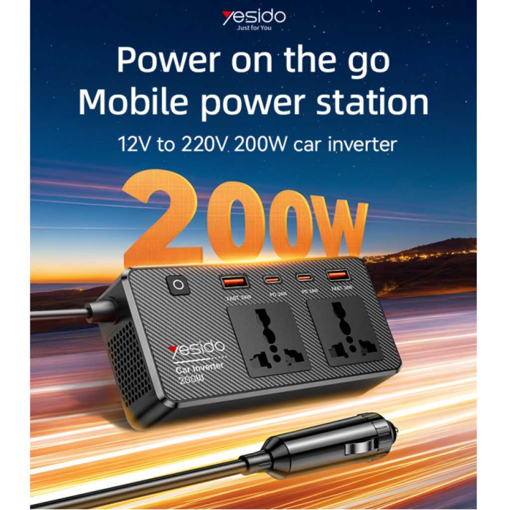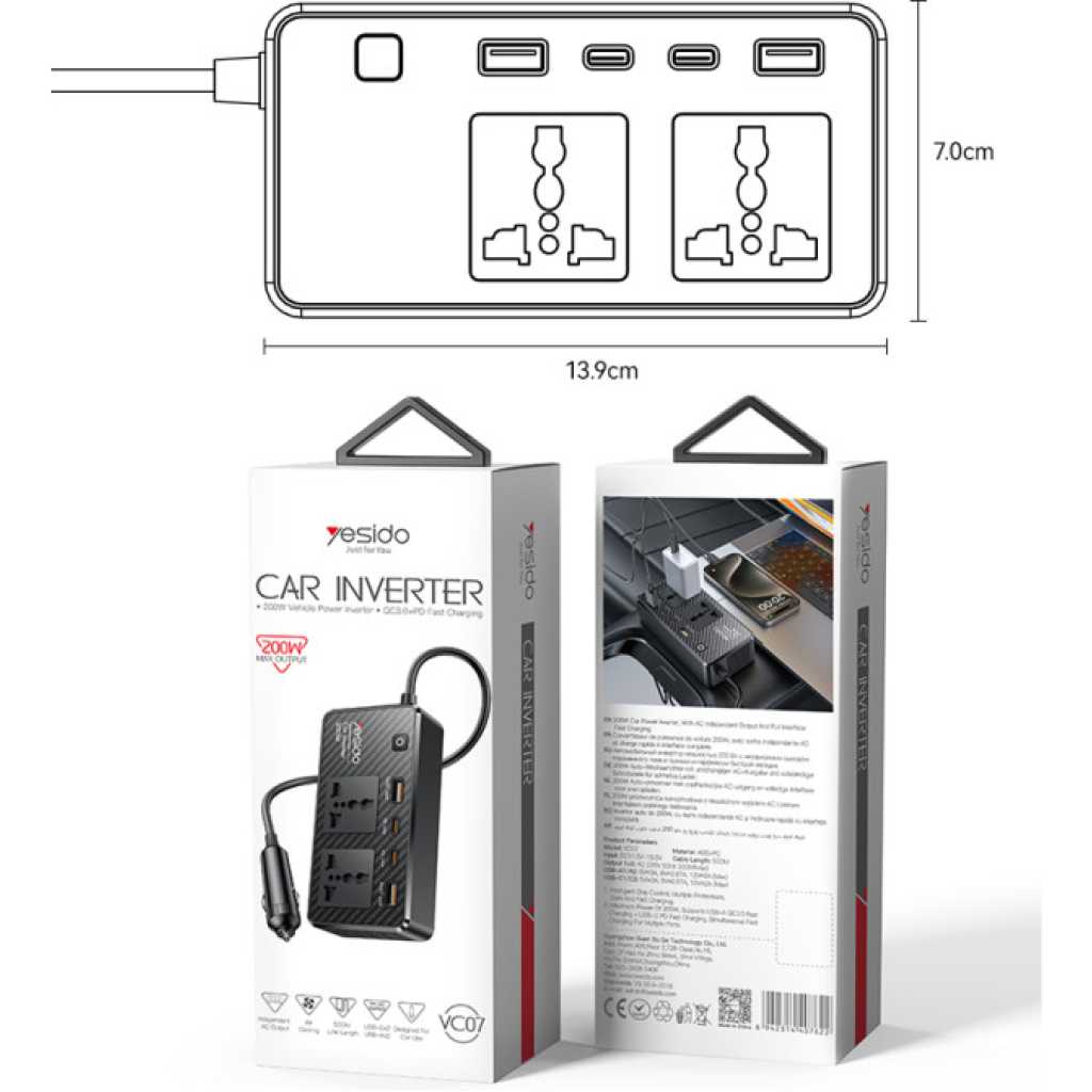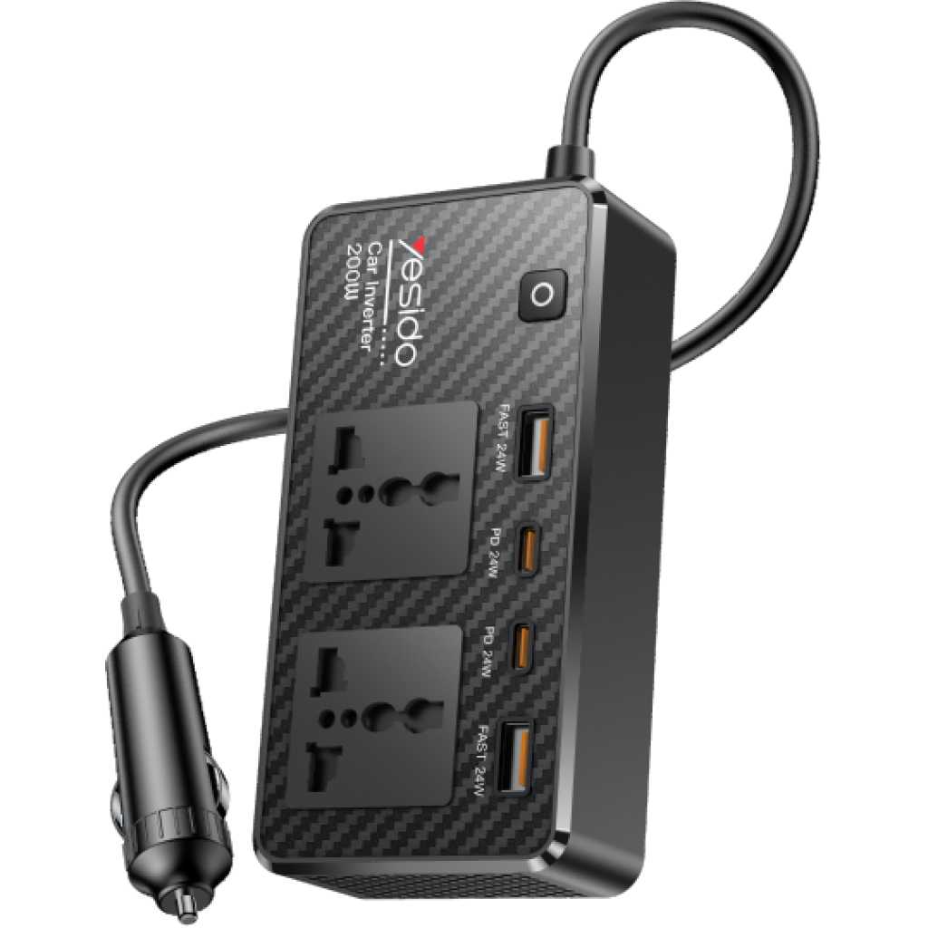 Y65 Yesido 12V To 200V Incependent Switch Multiple Protections USB QC3.0 + Type-C PD Fast Charging 200W Car Inverter.
